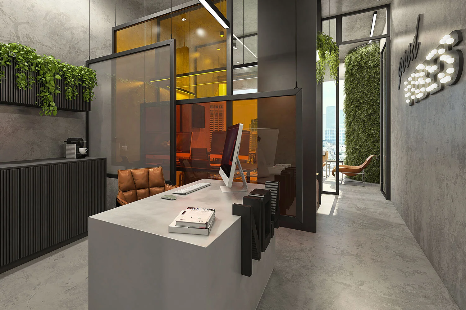 פרויקט זה הוא חלל צר הממוקם בקומה השישית בבניין משרדים בעיר רמת גן. צוות העיצוב השתמש באינטראקציה בין מבנה לחלל כדי לשחרר את התנועות החופשיות של הקווים בו לחלון הגדול שעומד כתמונה בקיר - כאשר בשימוש המבנה הצר, הובלנו את המבקרים מהחלל הקלאסי לתמונה הדינאמית הכי ריאליסטית שמצאנו - חלון המשרד.